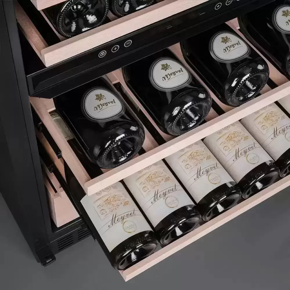 Винный холодильник Meyvel MV154PRO-KBT3 имеет несколько температурных зон, в которых одновременно можно хранить разные сорта алкоголя и выставлять разные сочетания настроек. Он встраивается в нишу, что удобно, если у вас ограничен метраж помещения. Количество бутылок, которое можно разместить с учетом полной комплектации и из расчета объема бутылки 0,75 л, — 154 шт.